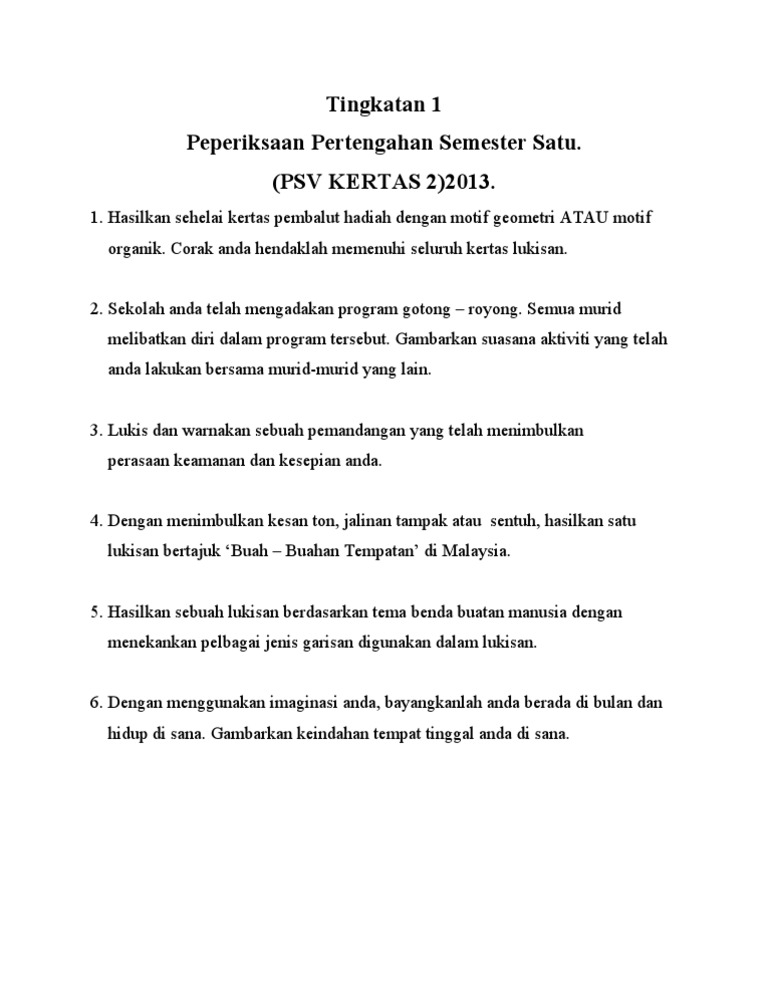 View Soalan Seni tingkatan 1docx from SENI 123 at Sultan Idris University of Education. Koleksi soalan sebenar spm dan skema jawapan. Modul Soalan Pendidikan Seni Visual PSV SPM Tingkatan 4 dan 5 Jawapan.